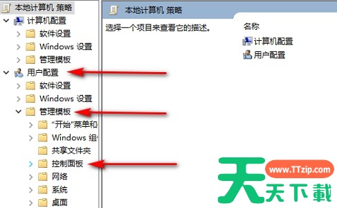 3、根据图中所示,依次点击“用户配置”、“管理模板”和“控制面板”