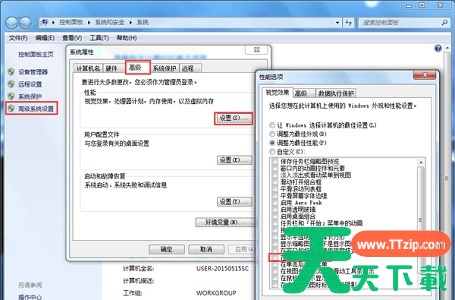 3、接着在高级系统设置中,找到性能选项,取消勾选“在窗口下显示阴影”即可。