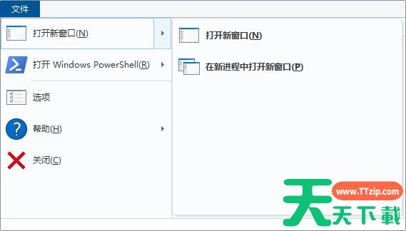 1、如图所示,窗口文件菜单有“打开新窗口”、打开“windows powershell”、“选项”、“帮助”和“关闭”