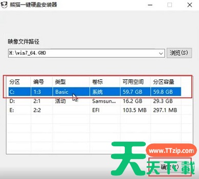 3、然后在其中选择硬盘分区,并点击右下角“确定”