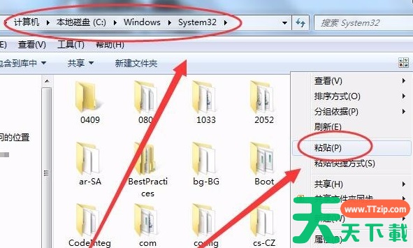 6、System32文件夹中,右击粘贴文件。