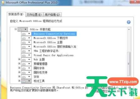 4、选择自定义安装”—>“office 共享功能”—>将"business connectivity services"设置为不可用,如图所指—>下一步,即可。