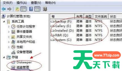 2、随后可以看到“磁盘管理”,点击管理,即可查看各个分区的信息。