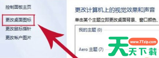 2、在个性化窗口的左侧找到“更改桌面图标”打开。勾选“网络”,点击确定。
