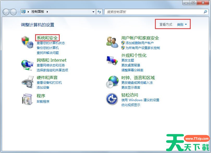 2、查看方式选择为类别,找到系统和安全,点击进入;