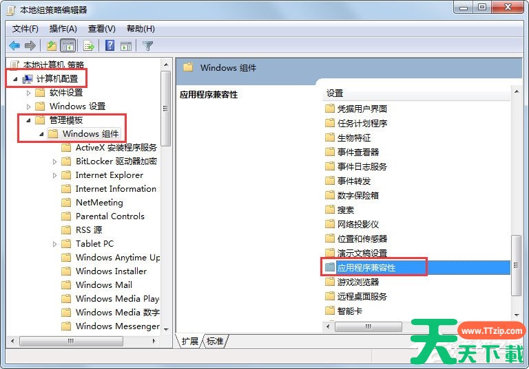 4、在组策略编辑器对话窗口中,依次展开左侧的“计算机配置”--》“管理模版”--》“Windwos组件”选项,在右侧窗口中找到“应用程序兼容性”选项并双击打开;