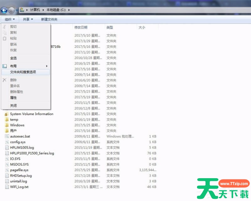 2、选择【组织】菜单——文件夹和搜索选项;