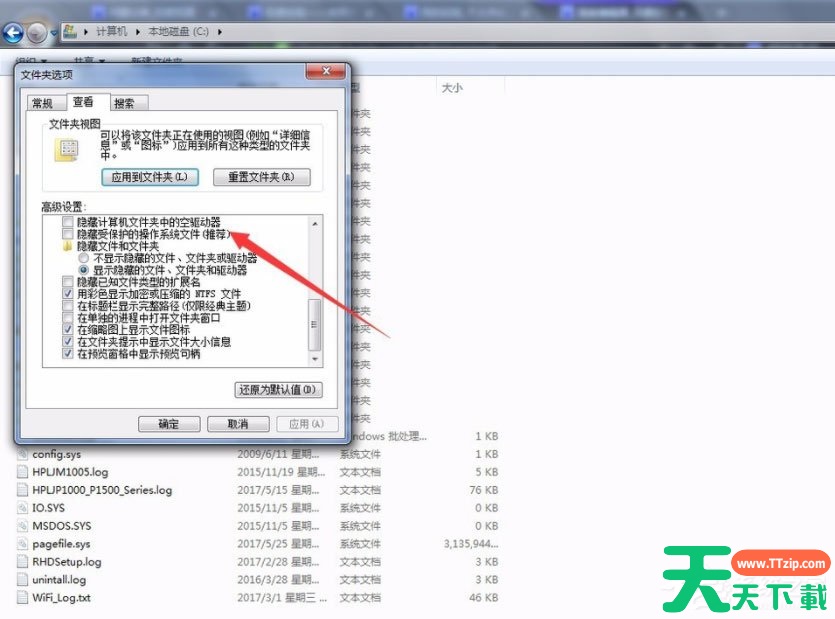 3、选择【查看】,去掉【隐藏受保护的操作系统文件】前的勾,确定;