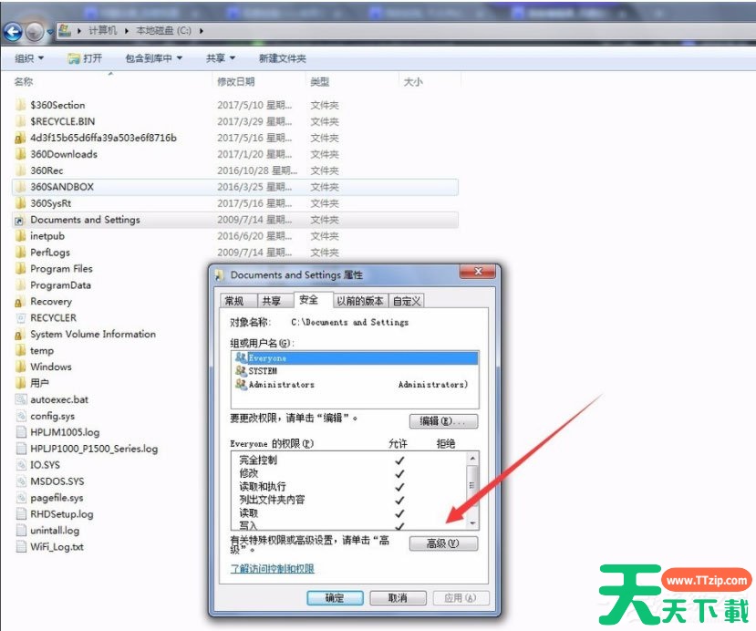 5、选择Documents and Settings系统文件夹,右键选择【属性】,选择【安全】选项卡,点击【高级】;