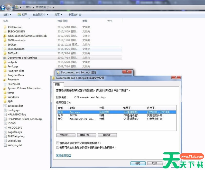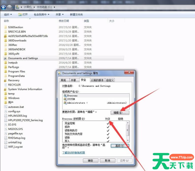 7、回到最前面的窗口,点击【编辑】,勾选【完全控制】,默认允许下是没有任何权限的,确定后就可以双击Documents and Settings系统文件夹访问了,此时可以看到Documents and Settings系统文件夹可以正常访问。