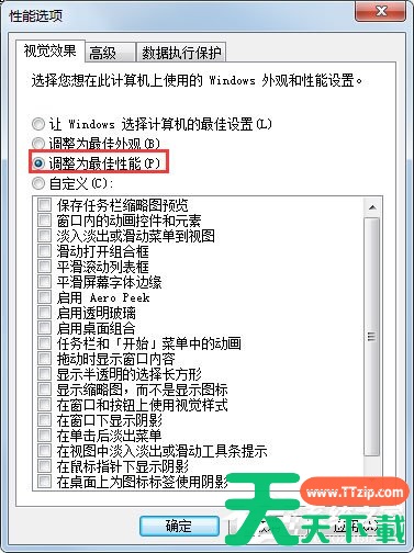 4、选择“性能”选项,选择“调整为性能最佳”;
