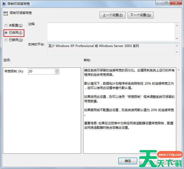 3、双击限制可保留带宽选项,选中左边第二个选项“已启用”;