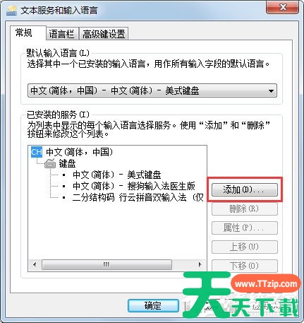 3、在更改输键盘界面,点击更改键盘,然后在选项框内设定默认的输入法和不同输入法的位置,如果看不到输入法选项,点击添加键,在系统里面找到中文输入法加入即可;