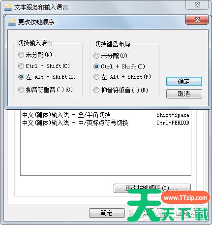 4、添加完输入法如果有无法切换输入法的问题,只需要在更改键盘里面的高级键设置选项中将输入法的切换设置左Ctrl+Shift即可自由切换输入法了;