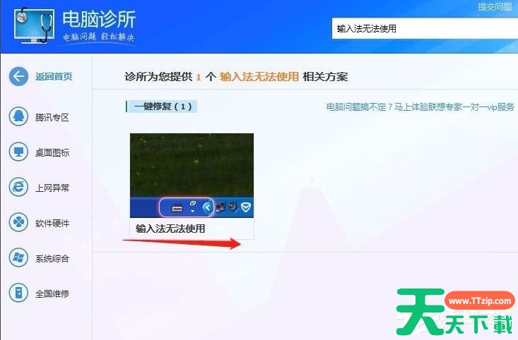 5、另外还可以借助电脑管家的功能快速修改输入法异常消失现象,只需要安装电脑管家,点击电脑诊所,在一键修改里面找到输入法无法使用,然后点击修改即可使用。
