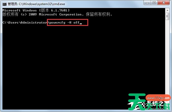 3、在打开的管理员身份编辑页面,输入“powercfg -H off”,它的意思是,关闭休眠的文件,这样C盘空间就会多出很多的;