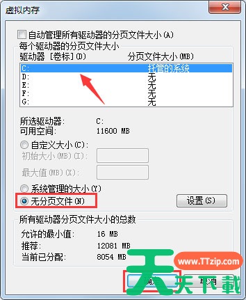 6、在出现的窗口中,找到“无分页文件”,并用鼠标在前面的圆圈中打上勾,单击一下下方的“确定”选项;