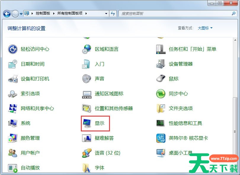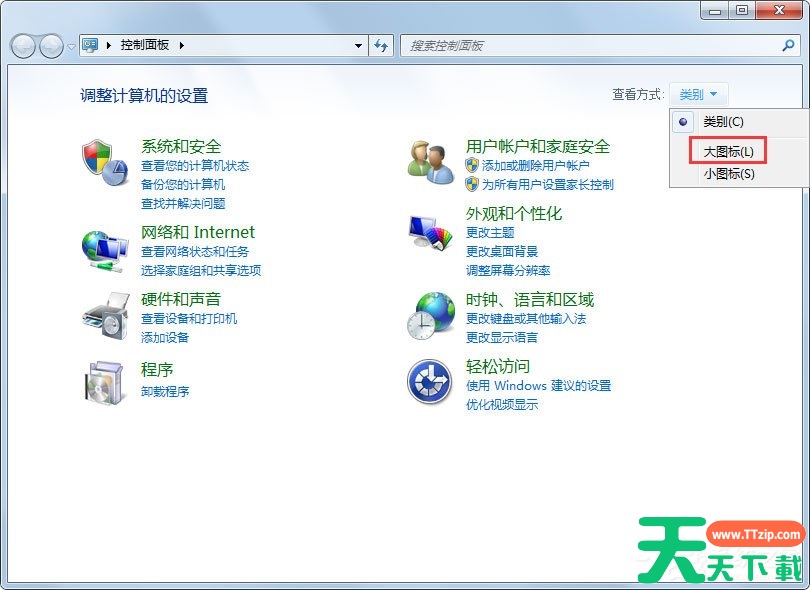 2、将【控制面板】文件夹的【查看方式】更改为【大图标】选项;