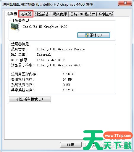 7、在【监视器】选项卡中将【屏幕刷新频率】中频率调到最高并单击【确定】按钮即可。