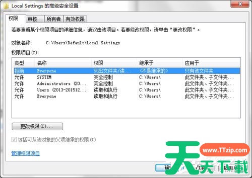 6、在Local Settings的高级安全设置窗口中,选中“Everyone”(类型为拒绝,说明权限未开启),点击“更改权限”;
