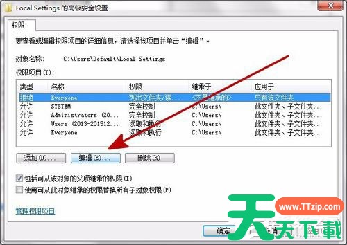 7、在更换权限窗口,选中“Everyone”,点击“编辑”,进入权限项目设置;