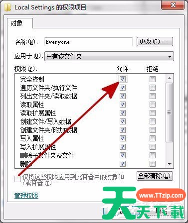 8、在权限项目设置窗口,勾选“完全控制”,所有的项目都变为允许,然后点“确定”关闭窗口,即可打开Local Settings文件夹了。