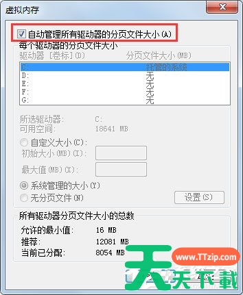 6、在虚拟内存页中,将第一行的小方框中的对勾取消,因为如果不取消下面的设置部分是灰色的不可更改的状态,只有禁用自动管理功能才能自定义设置;