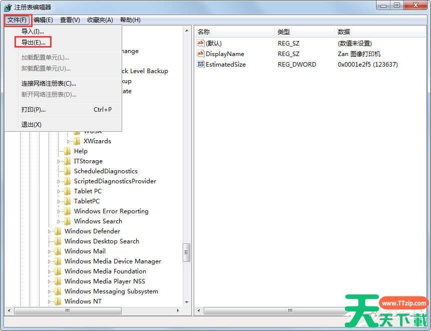 3、大家记得修改注册表前都先备份一次当前注册表,确保万无一失。如果修改注册表出问题了可以恢复到备份的状态;