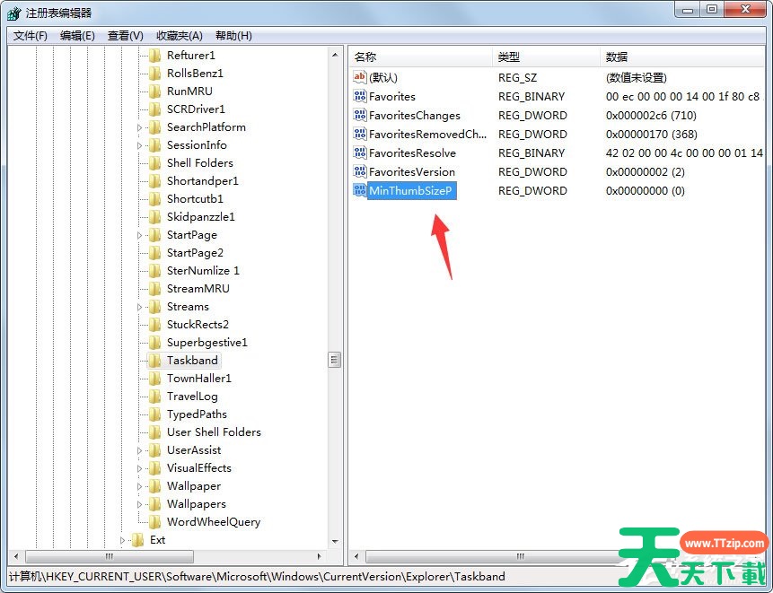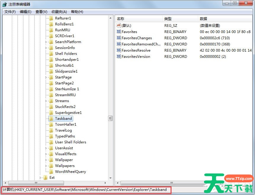4、用鼠标点击定位到路径:HKEY_CURRENT_USER\Software\Microsoft\Windows\CurrentVersion\Explorer\Taskband;