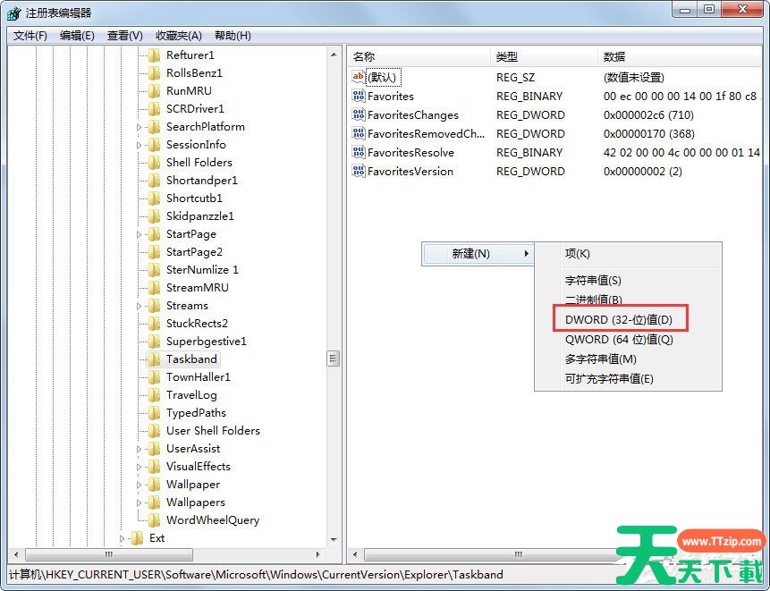 5、选中Taskband点击右键,选择新建 DWORD (32-位)值(D);