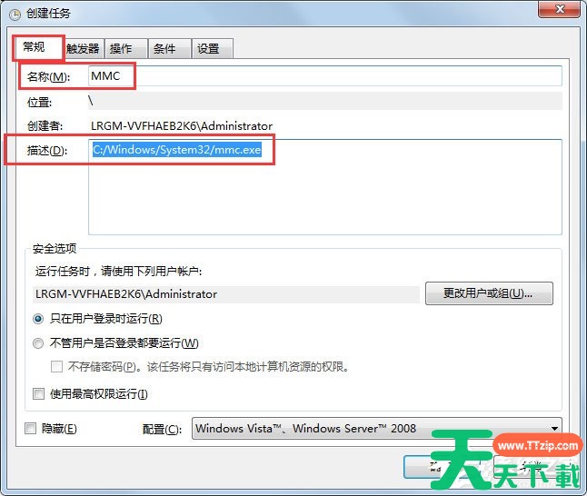 5、在“常规”页面中,把名称编辑为“MMC”,描述处大家可以随意填,但大家要记住填的内容是什么,方便于好找到这个任务;