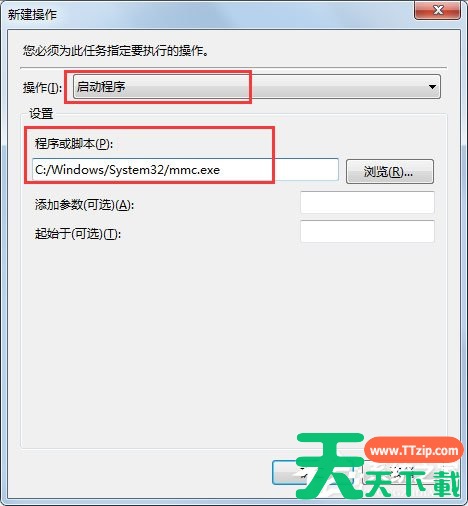 6、上一步确定后,弹出新建操作,在“操作”中调整为“启动程序”,“程序或脚步”处输入地址C:/Windows/System32/mmc.exe,然后确定;