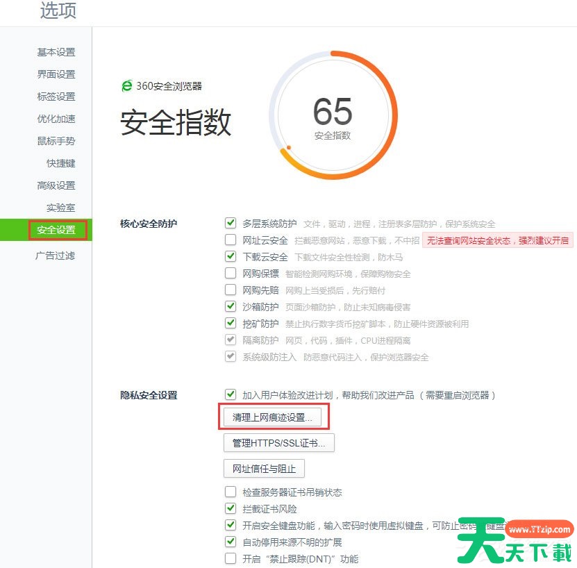 1、浏览器中选择“安全设置”——“清除上网痕迹设置”,全选点击“立即清理”;