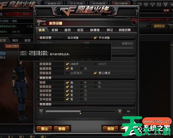 7、进入游戏后,在设置中将全屏改为16bit,然后屏幕亮度调整为32即可在游戏中透过烟雾看到敌人。