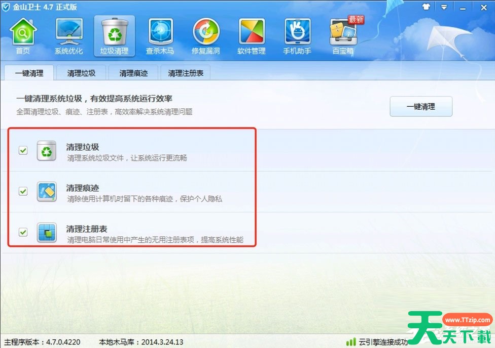 2、点击垃圾清理选项,将其三个复选框选项都选上,点击一键修复按钮。
