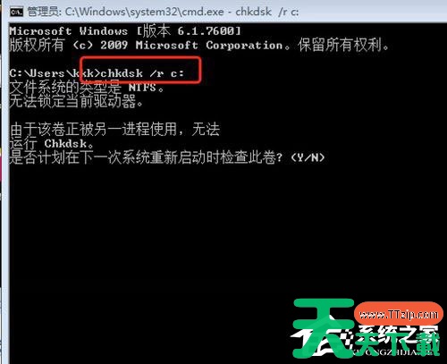 3、无法运行chkdsk,是否计划在下次系统重新启动时检查这个卷?(Y/N),我们输入“Y”,回车。