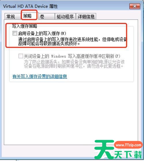 3、在属性窗口,左键点击:策略,再点击:启用磁盘上的写入缓存(W),去掉前面小方框内的勾。