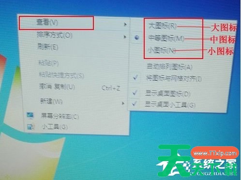 2、那怎么调节图标的大小呢?用鼠标在桌面空白处右击,将其鼠标移动至“查看”选项我们可以根据需要选择适合自己的图标大小,来选择适合的图标大小;