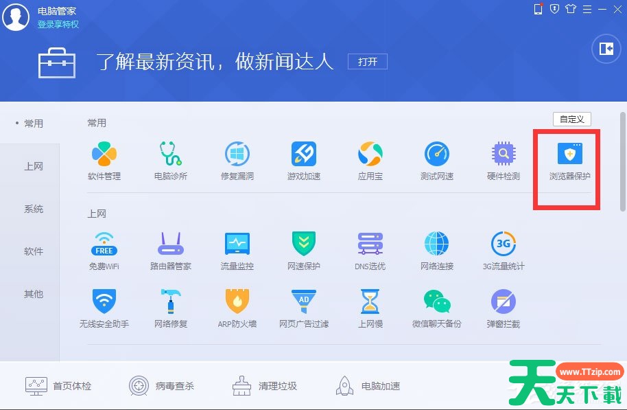 1、还有一个方法就是现在的很多安全软件都有锁定主页防止而已篡改的功能,我们可以用腾讯电脑管家——工具箱——浏览器保护功能;