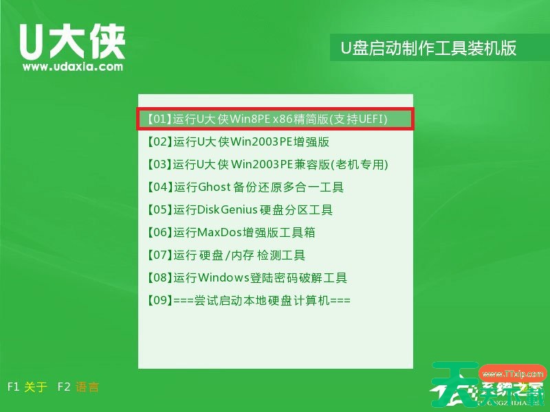 1、当我们利用按快捷键选择您的U盘启动进入到U大侠主菜单后,按上下↑↓方向键选择到“【01】 运行U大侠Win8PEx86精简版(支持UEFI)”,然后按下“回车键”,将进入U大侠Win8PE系统;