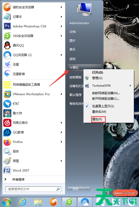 打开设备,点击“开始菜单”,右键单击“计算机”,再选取“属性”;