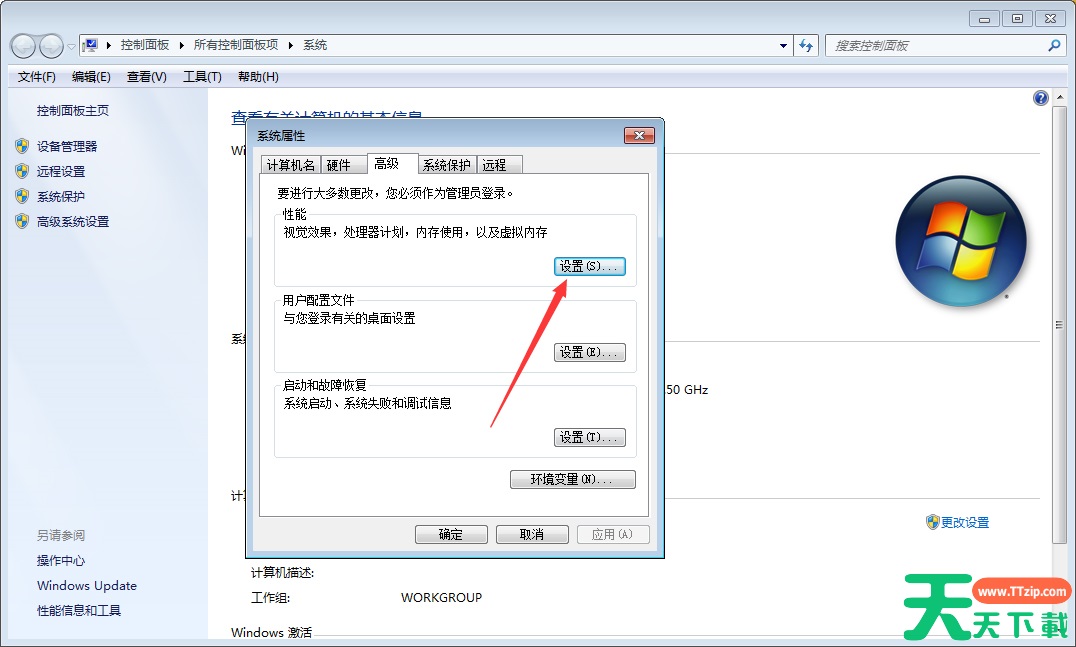待系统属性窗口弹出后,在“高级”一栏中找到“性能”,再点击其中的“设置”按钮;
