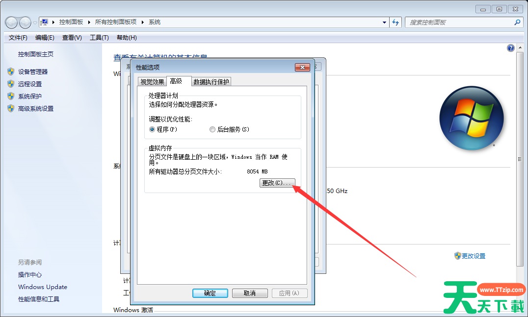 接着,在性能选项窗口内的“高级”页面中找到虚拟内存更改按钮;