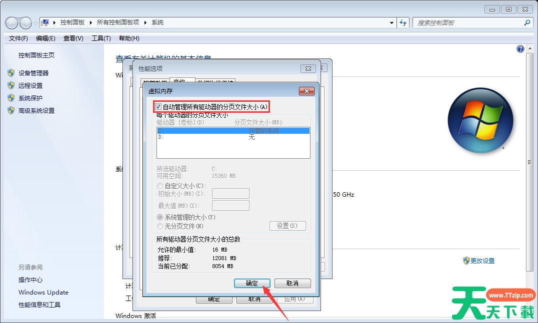 点击该按钮后,勾选“自动管理所有驱动器的分页文件大小”,再按下“确定”即可。