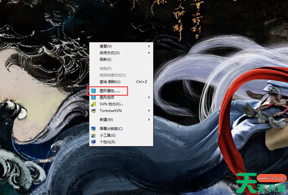 鼠标右键点击桌面空白处,并选取“图形属性”;