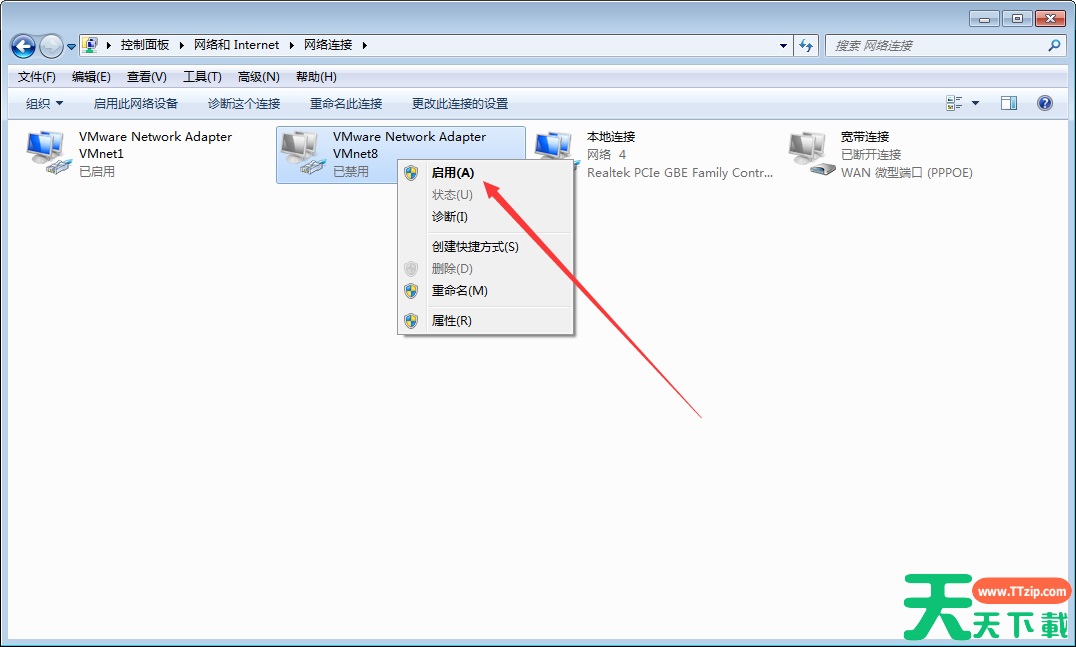 鼠标右键选取被禁用的网络连接,再选择“启用”即可。