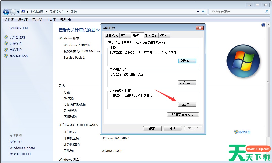 待系统属性窗口弹出后,选取启动和故障恢复栏内的“设置”选项;