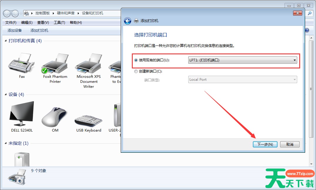 选择打印机端口,再次点击“下一步”;