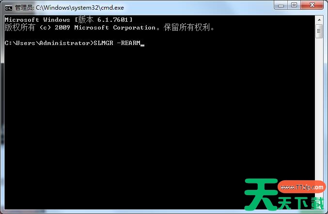 第二步、进去之后,在命令提示符输入“ SLMGR -REARM ”,按回车键,如下图所示: