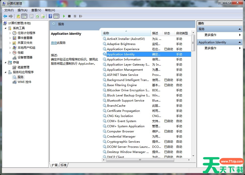 1、在桌面的计算机图表上点击右键→管理→服务,找到Application Identity服务;